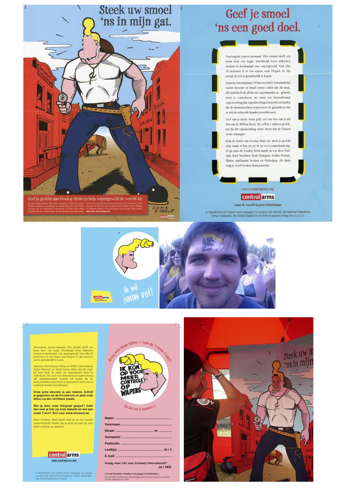 Festivalactie op Rock Werchter voor Amnesty tegen de wapenwedloop. Wie zijn Cowboy Henk-foto liet nemen, kreeg een plaktattoo en kon een uniek T-shirt winnen.